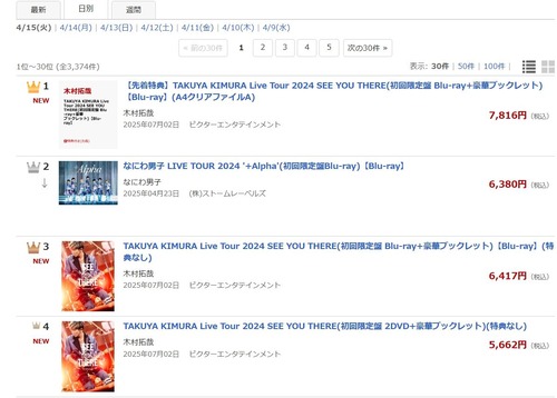7月2日に発売決定した木村拓哉ライブBD&DVD『TAKUYA KIMURA Live Tour 2024 SEE YOU THERE』が、Amazonやセブンネット、楽天ブックスの売上ランキングで1位に浮上しました。