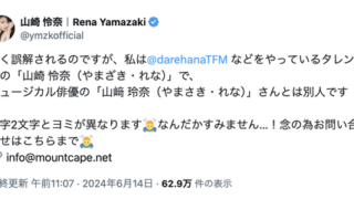 エンタメ山崎怜奈『よく誤解されるのですが、私はミュージカル俳優の「山﨑 玲奈(やまさき・れな)」さんとは別人です。漢字2文字とヨミが異なります。なんだかすみません…!』【元乃木坂46】 続きを読む Source: NOGIZAKA 1/46 2024.06.16エンタメ